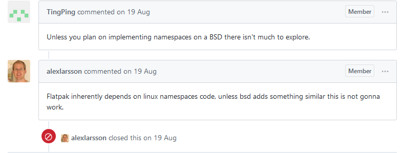 We, the people who work on and use FreeBSD on laptop, don't have any problems with technology made for Linux, like some developers at Red Hat think. FreeBSD is happy to adopt Red Hat's innovations if they improve the system. However, the question is: where would FreeBSD even need Flatpak?