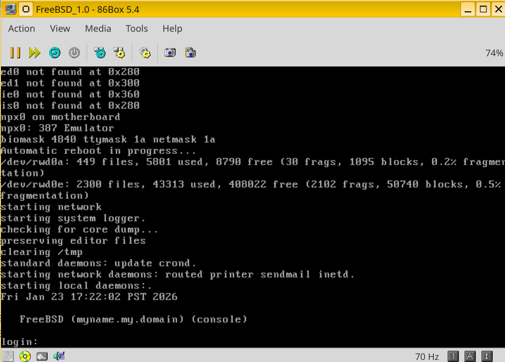 As we reboot, we'll be now greeted into a configured and installed FreeBSD running multiuser environment and services. We can login with root, no password is set.