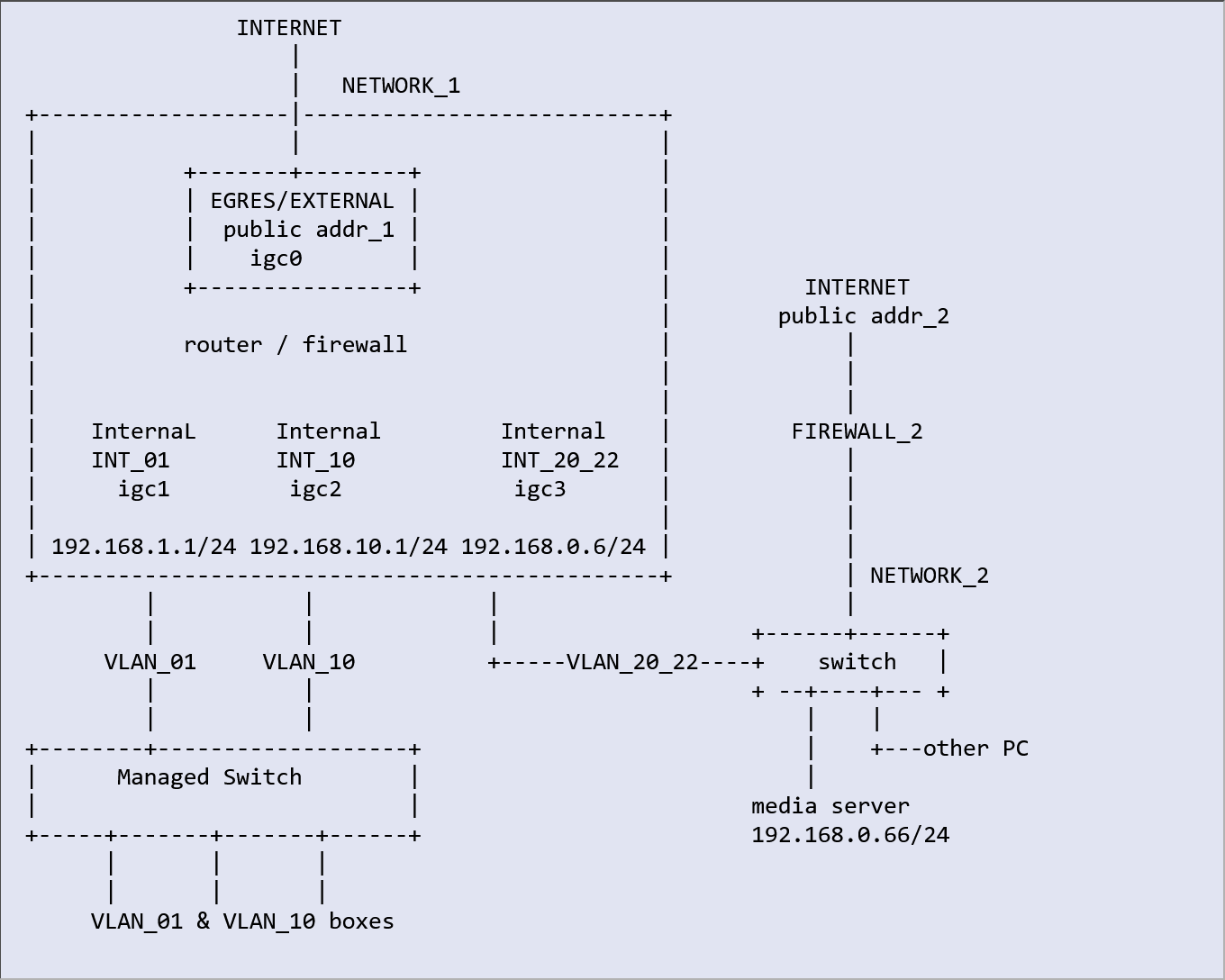 I am trying to separate my network (Network_1) form a network that I have been sharing with my landlord (Network_2), see the attached drawing. At this stage, the router/firewall/managed switch is working. I would like to share (at least temporarily) the media server that is on the Network_2.