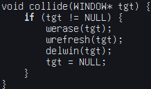bool collide(WINDOW* tgt) and return true to signal to the caller that it collided, and the caller can null it out there, or collide needs to take a pointer to a pointer to a window. probably changing to a bool is betterwerase() as before, so what the hell could i be missing this time (updated the code on git so that you can see it)NULL OUTSIDE shoot(), tgt is still shoot()'s scope only so it has to act as a signaler for actually killing the windowoh you're cleaning up the value too early. you probably need some way of signaling extra data with your window, indicating "collided", and then clean those up next frame.oh my fucking Arceus, i had to make the target windowNULLOUTSIDEshoot(),tgtis stillshoot()'s scope only so it has to act as a signaler for actually killing the window