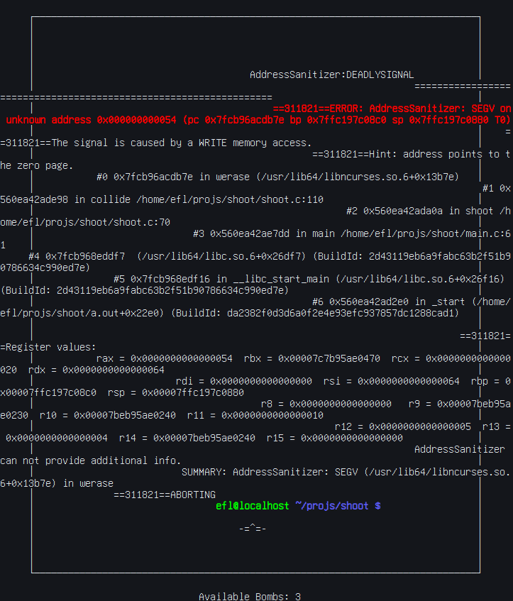 clang -fsanitize=address and/or lldb NULL, but because it got deleted interacting with its pointer results in a segfault, so i have to find another approach to checking whether the enemy's window (hitbox) got hit in order to make it die properlyfrom: https://pubs.opengroup.org/onlinepubs/7908799/xcurses/endwin.htmlThe endwin() function does not free storage associated with a screen, so delscreen() should be called after endwin() if a particular screen is no longer needed.