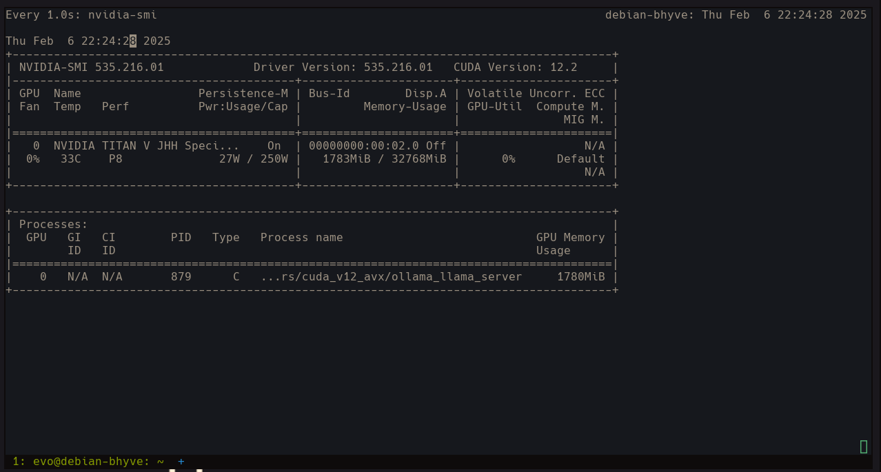 Feb 06 22:19:27 debian-bhyve ollama[842]: llama_load_model_from_file: using device CUDA0 (NVIDIA TITAN V JHH Special Edition) - 32189 MiB free